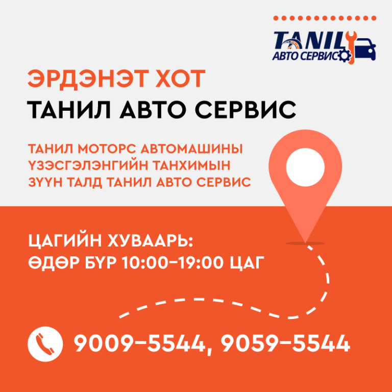 - Эрдэнэт хот. Танил Моторс автомашины үзэсгэлэнгийн танхимын зүүн талд ТАНИЛ АВТО СЕРВИС