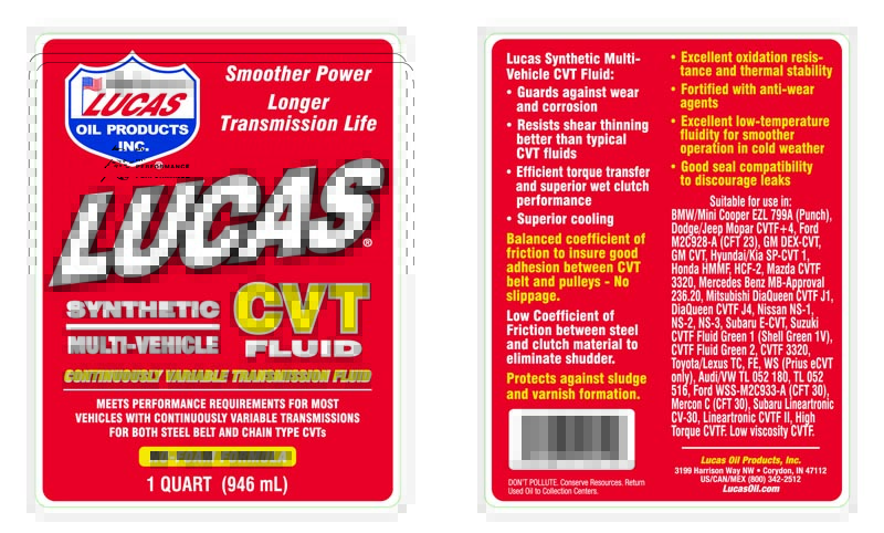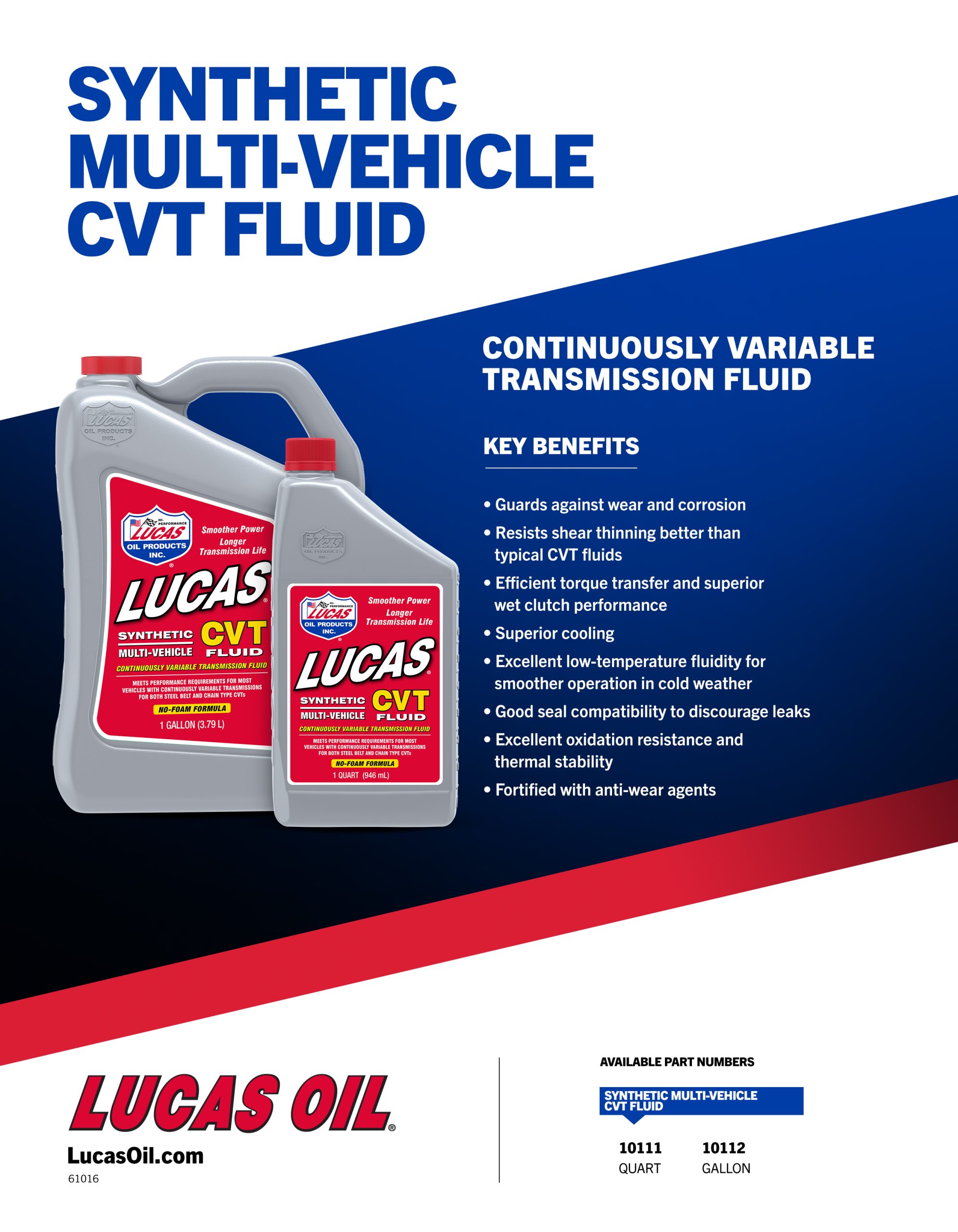 Lucas Synthetic Multi-Vehicle CVT Fluid нь ган бүсээр эсвэл гинжээр ажилладаг тасралтгүй хувьсах хурдны хайрцагтай суудлын автомашинд тусгайлан зориулагдсан